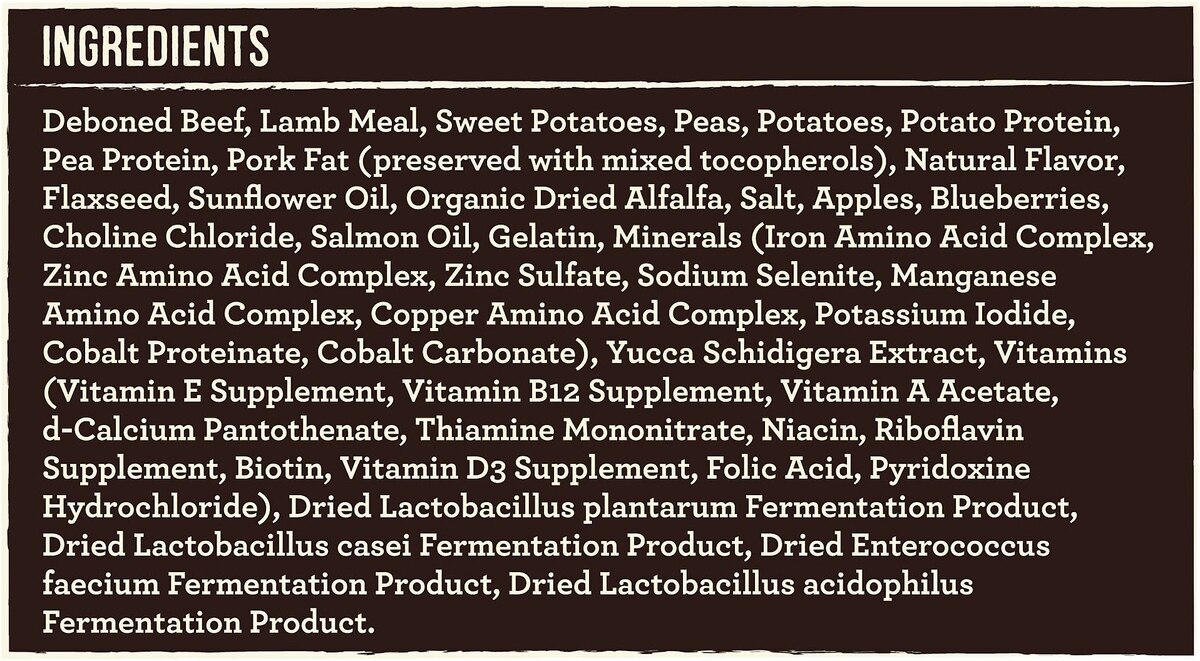 • Real, deboned beef is always the first ingredient in this grain-free kibble; it’s made with real food ingredients to deliver balanced nutrition for adult dogs.