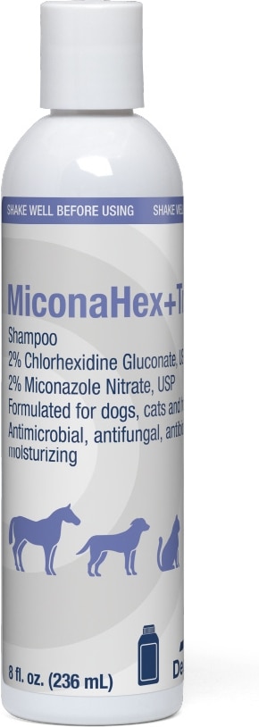 MiconaHex+Triz is for use on dogs, cats, and horses. Available as shampoo, spray conditioner, wipes, and mousse, it’s antimicrobial, antifungal, antibiofilm, and moisturizing. Indicated for conditions responsive to miconazole and/or chlorhexidine.