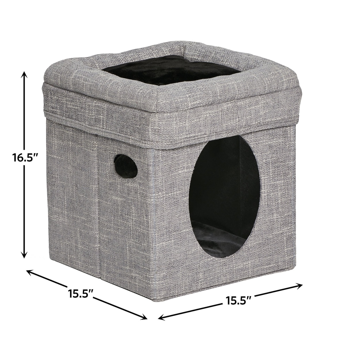 This cat condo measures approximately 14.6 inches long x 15.36 inches wide x 15.3 inches high.