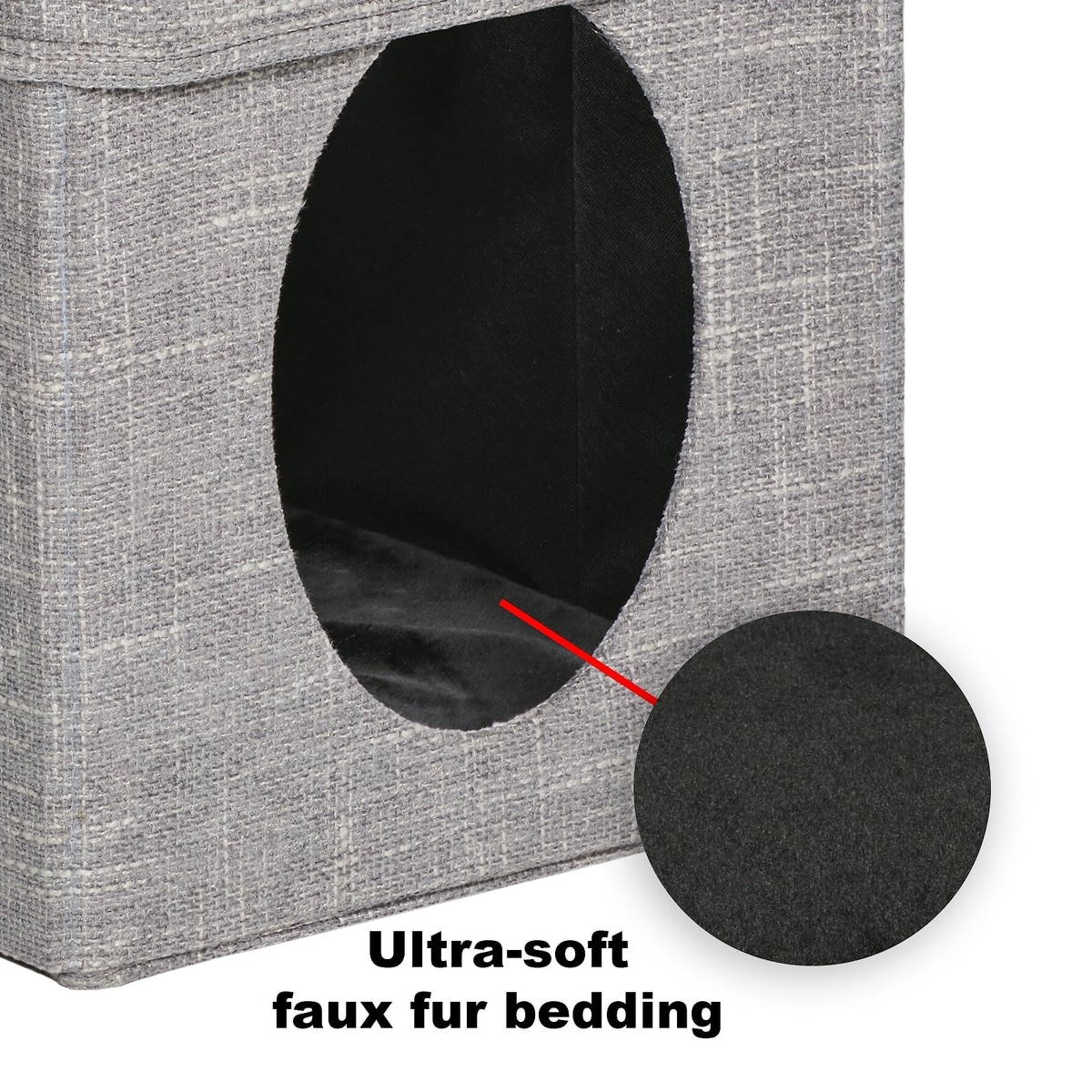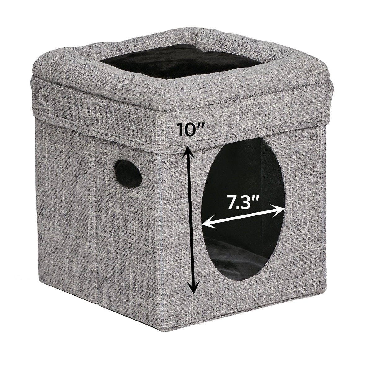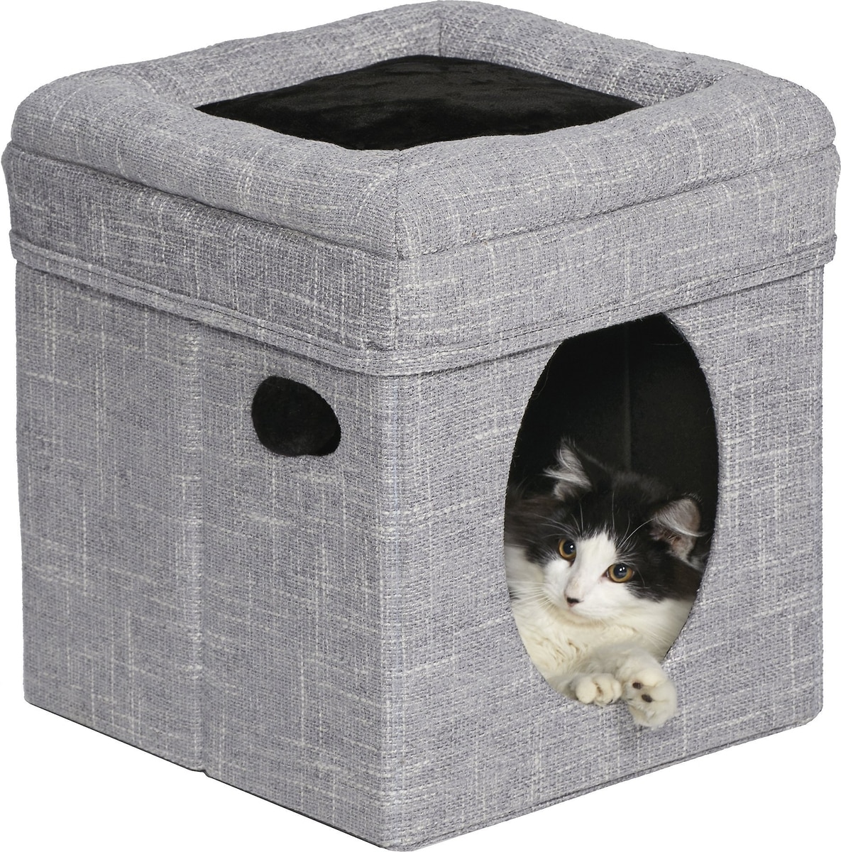• Interior hide-away with large, easy-access opening offers safety and security for napping in purr-fect peace and quiet.