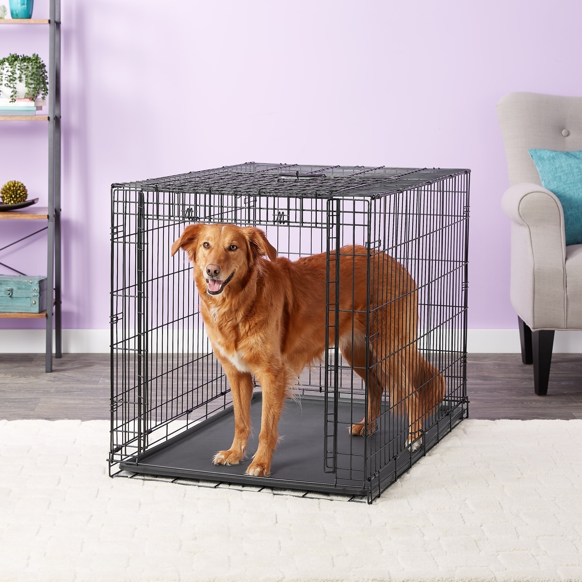 For a lightweight crate that requires no tools, folds flat, and still has the security of heavy-duty slide-bolt latches, look no further than the MidWest iCrate. It’s made for easygoing dogs and even comes with a divider panel so it can grow with your pup. Pair that with a removable, ease-to-clean plastic pan, sturdy carrying handle, and surface protective rubber feet to create the recipe for a crate made just for your dog.