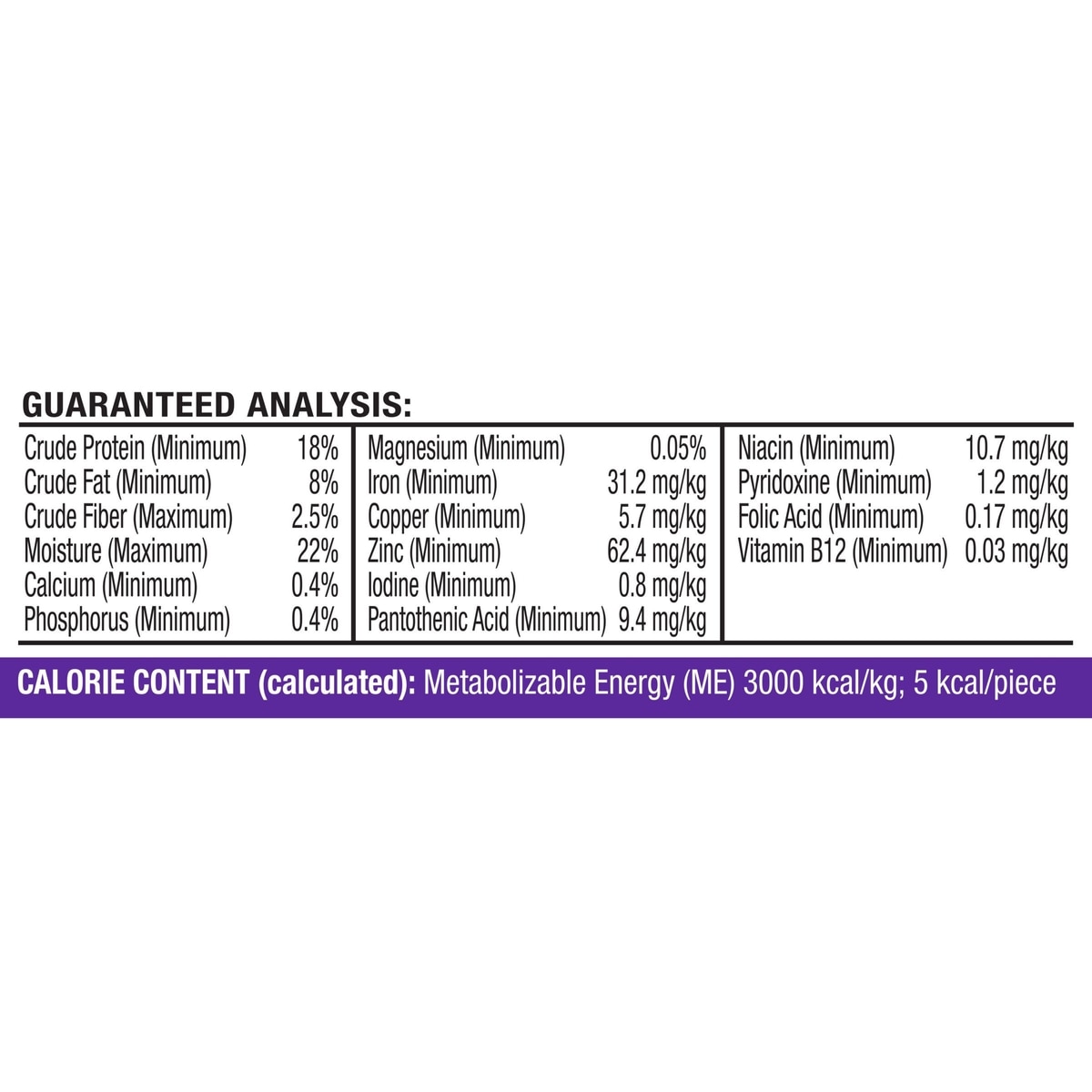 Beef, Chicken, Soy Grits, Sugar, Corn Starch, Dicalcium Phosphate, Rice Flour, Salt, Natural Smoke Flavor, Propylene Glycol, Guar Gum, Garlic Powder, Lactic Acid, Potassium Sorbate (Used As A Preservative), Vitamins (Vitamin E Supplement, Niacin Supplement, Vitamin A Supplement, D-Calcium Pantothenate, Riboflavin Supplement, Pyridoxine Hydrochloride, Thiamine Mononitrate, Vitamin D3 Supplement, Folic Acid, Biotin, Vitamin B12 Supplement), Minerals (Ferrous Sulfate, Zinc Oxide, Manganous Oxide, Copper Sulfate, Calcium Iodate, Sodium Selenite), Red 40, Yellow 5, Bha (Used As A Preservative), Blue 2.