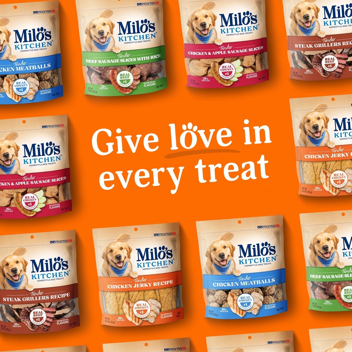 - Milo's Kitchen Chicken & Apple Sausage Slices Dog Treats, 10-oz$9.99 Chewy Price$9.49 Autoship PricePromo, New Customers Only: Spend $49+, Get $20 eGift Card +1 deal