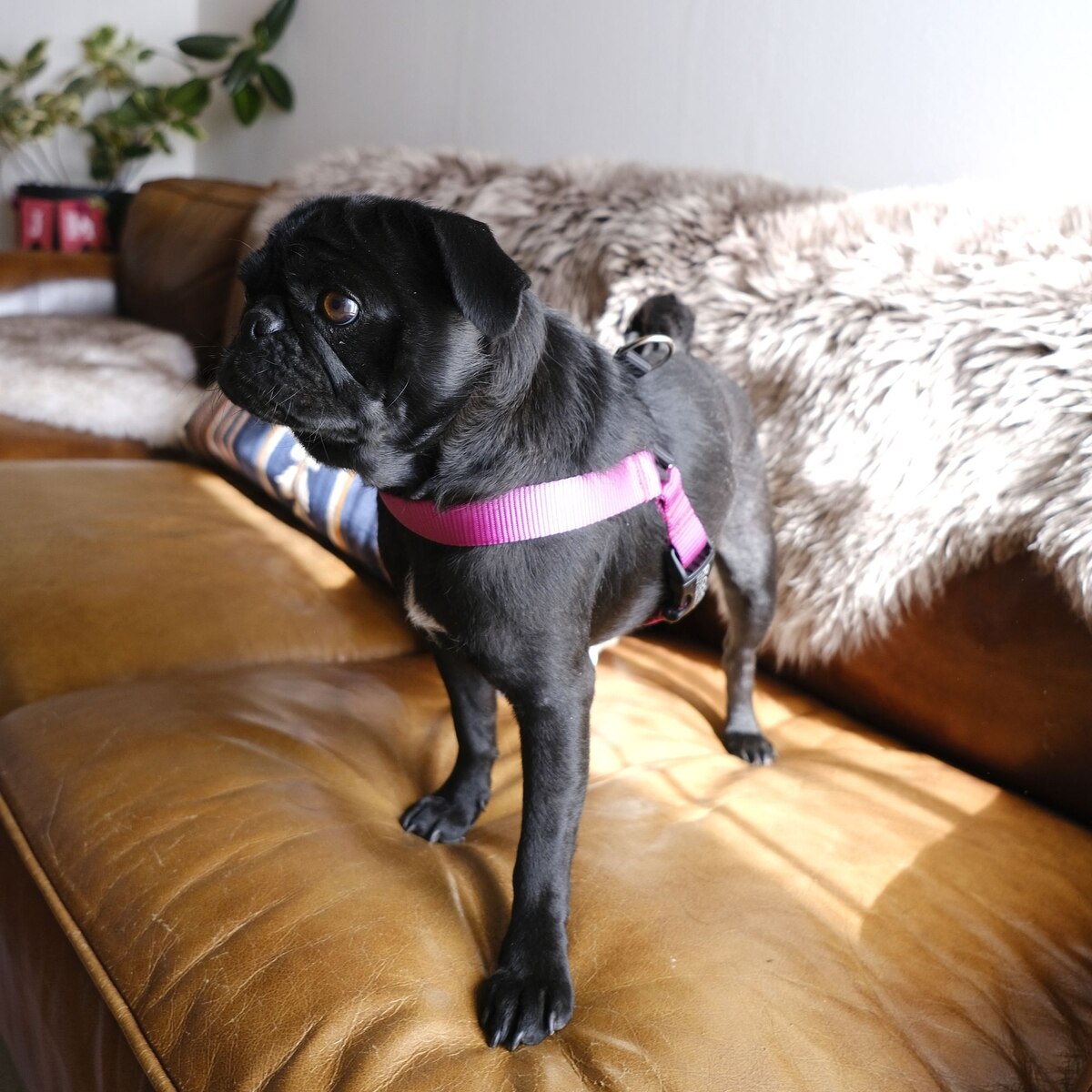 This harness was so easy to put on. I just slipped it over my pugs head and buckled the other side around their belly. I'm excited for the ease of use because it
