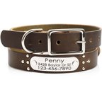 Mimi Green Studded Leather Dog Collar with Personalized Riveted Nameplate, Chestnut, Medium