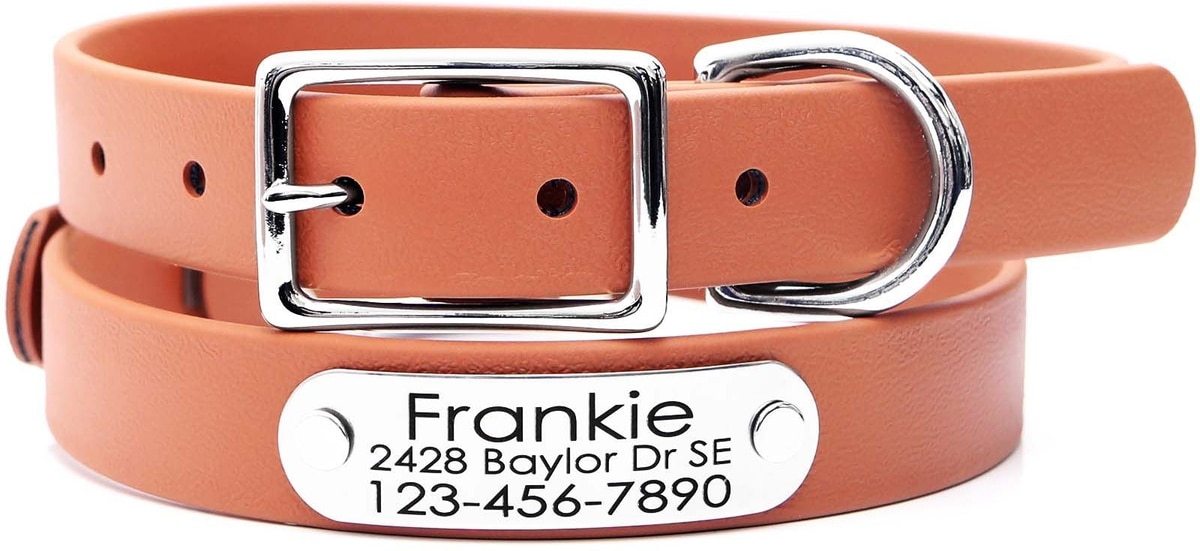 This collar features a polyester webbing on the inside with a durable PVC coating that protects against moisture, abrasions, rotting and stink.