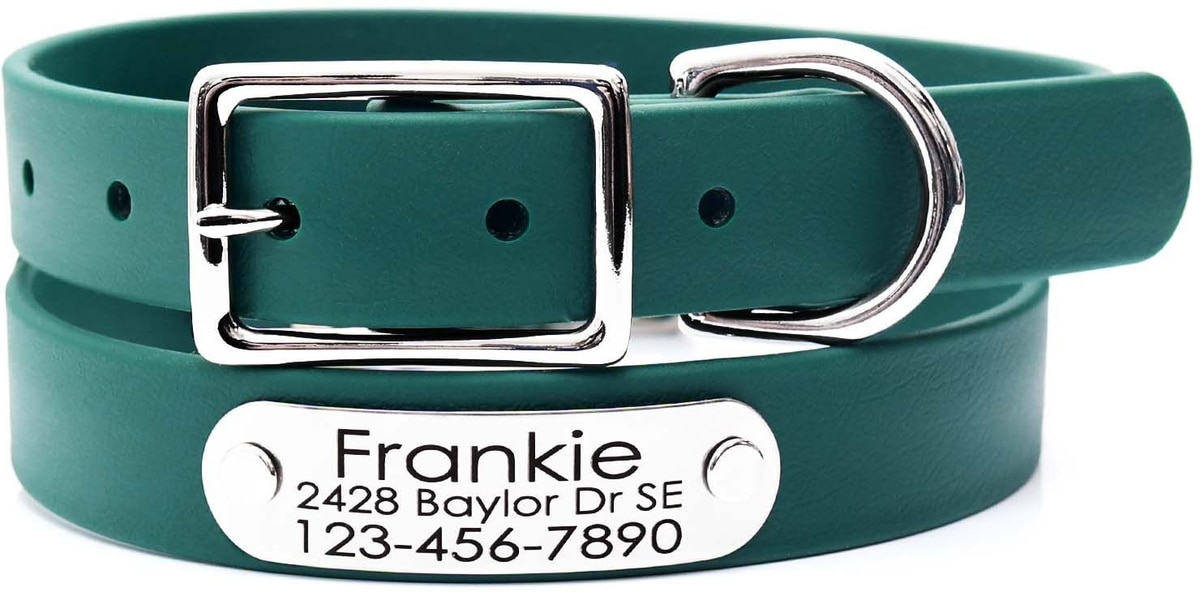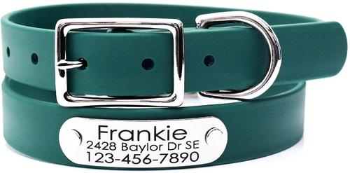 Mimi Green Waterproof with Riveted Name Plate Dog Collar, Forest Green, Large 1"