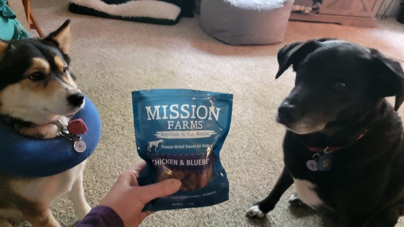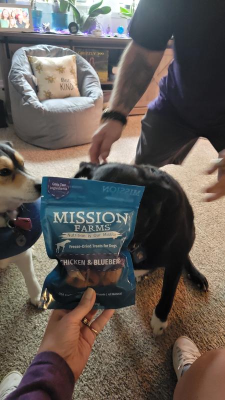 These Mission Farms Chicken & Blueberry Freeze-Dried Dog Treats have my two small dogs going bonkers! They LOVE them. They are huge fans of treats in general, but