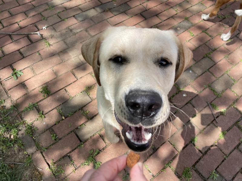 All the dogs enjoyed these treats! (a senior boxer hound mix about 75 pounds, a ~3 years old super mix 65 pounds, and their friend a eight month old lab). They were not a ‘come directly back when there is a varmint in the yard’ good, but all of them seemed happy to sit and do other basic commands for this treat. They seemed like a good quality as well and they must smell good to the dogs because there was a lot of sniffing! My main difficulty- and I think this is true with all freeze dried treats - is they do not cut and crumble very easily. These will be an at home treat because they just don’t travel well. I do a lot of training with the dogs so I tend to give them very small pieces of treat which was difficult with these. The bars will break easily but then it’s 50-50 whether it’s a clean break or crumble. This is the main reason for the four stars.