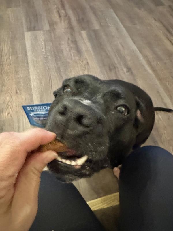 Mission Farms has a real winner here. This unique, flavorful dog treat is a favorite in our home. The treats are lightly crunchy, yet break easily for smaller