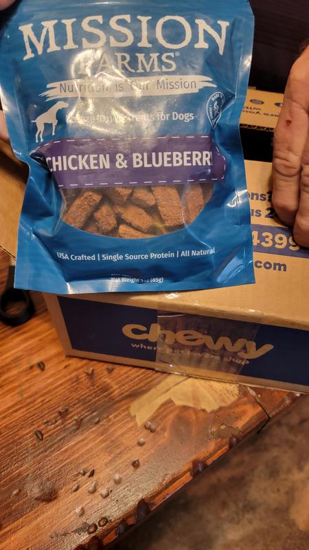 These Mission Farms Chicken & Blueberry Freeze-Dried Dog Treats have my two small dogs going bonkers! They LOVE them. They are huge fans of treats in general, but will usually take their treats, inhale them, and go on their way to do whatever doggy thing is next on their agenda. With these treats, though, they jump around begging for more!! We could easily be coerced into enabling some type of dog treat dependency situation with these if they had their way. The treats are puffy sticks that snap in half very nicely to create more treats.. They are such a huge hit that I will be buying some more for them and also for my daughter's two large dogs. I highly recommend these.