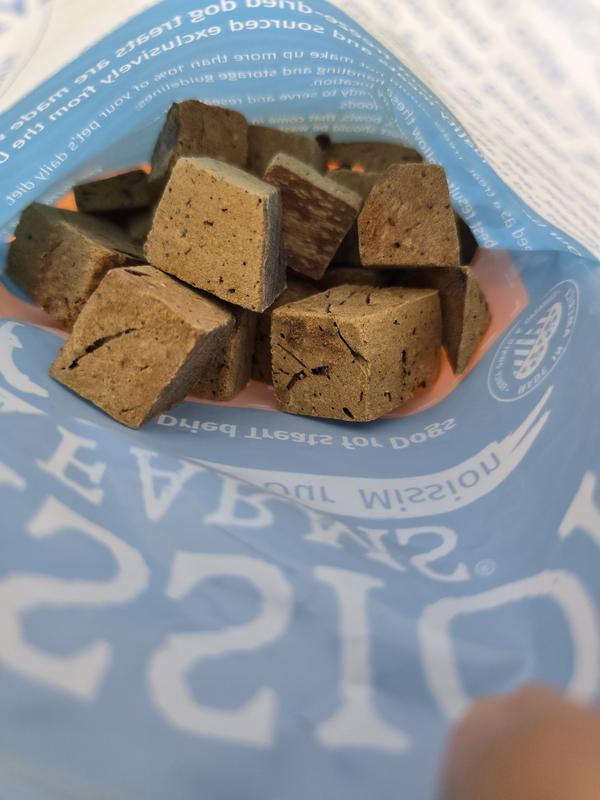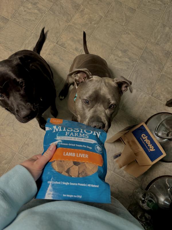 Received a bag of Mission Farms Lamb Liver treats. On first picking them up, I thought they did not have enough to feed my 12 dogs, but upon opening them, I saw they were freeze-dried and there were many pieces in the bag. The pieces are different sized, so I can feed the littles smaller pieces than I give the bigger ones. As soon as I open the bag, the smell is inviting, and I don't have to call for them to come running. As you can see from the pic, they are anxious for me to put the phone down and start treating! So, I would say that a purchase of Mission Farms should be on your next Chewy order.
