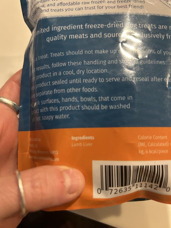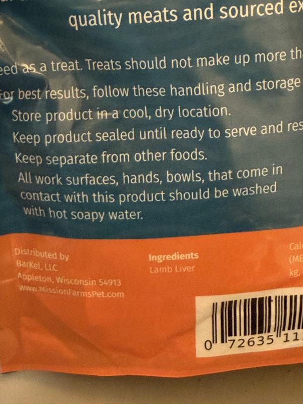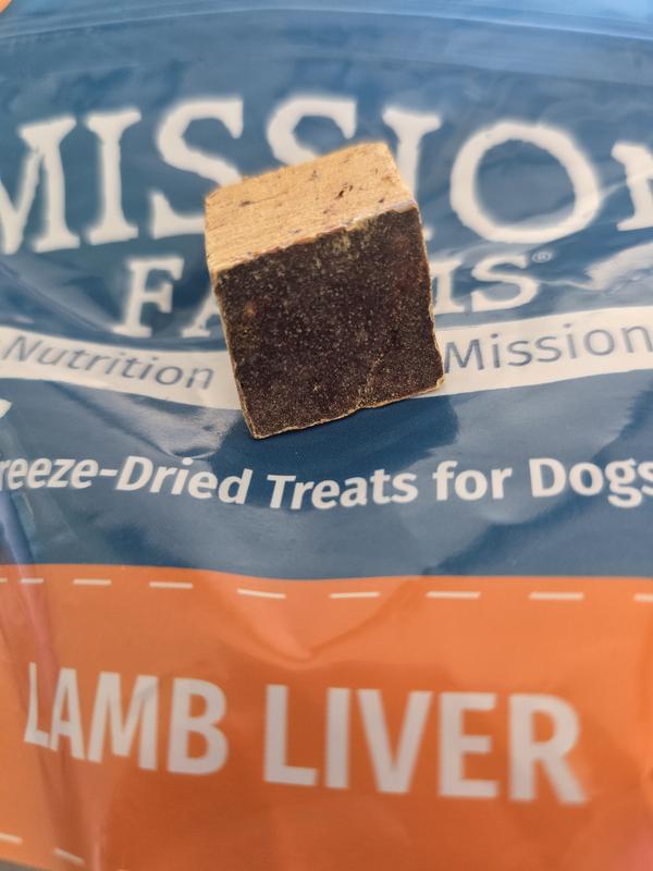 Received a bag of Mission Farms Lamb Liver treats. On first picking them up, I thought they did not have enough to feed my 12 dogs, but upon opening them, I saw