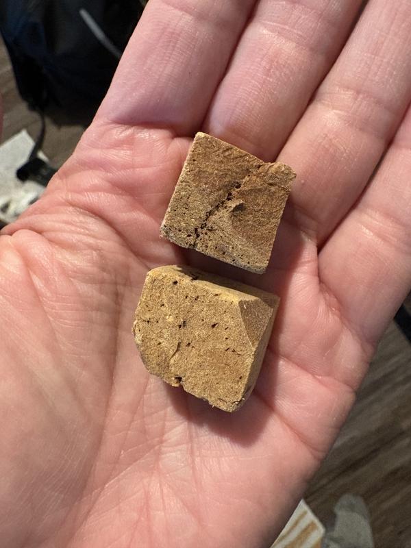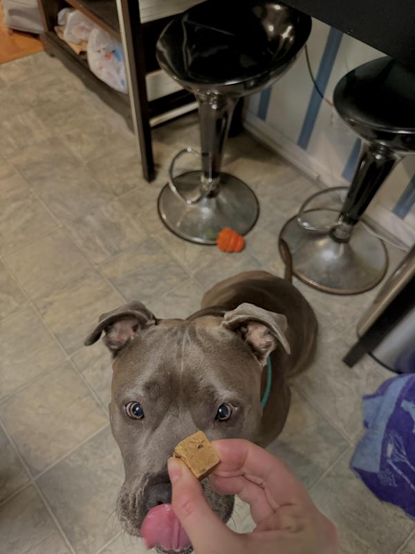 These treats are great. My pup loves them. I hide them in her puzzles and she happily digs around to find them. They’re cut into good chunks so they might be a bit