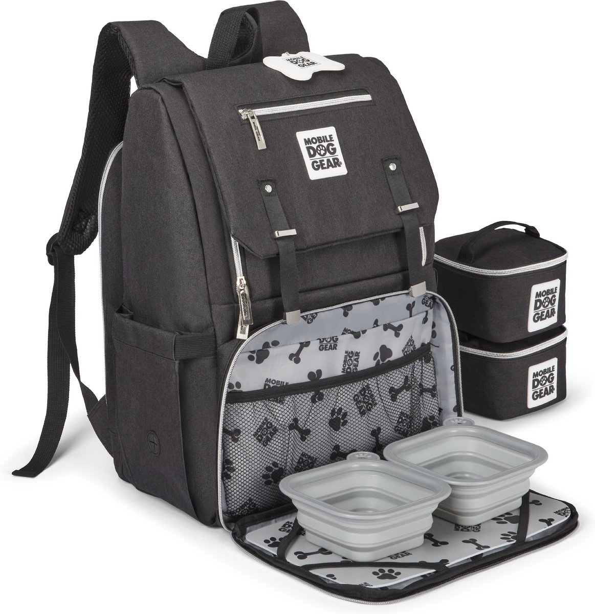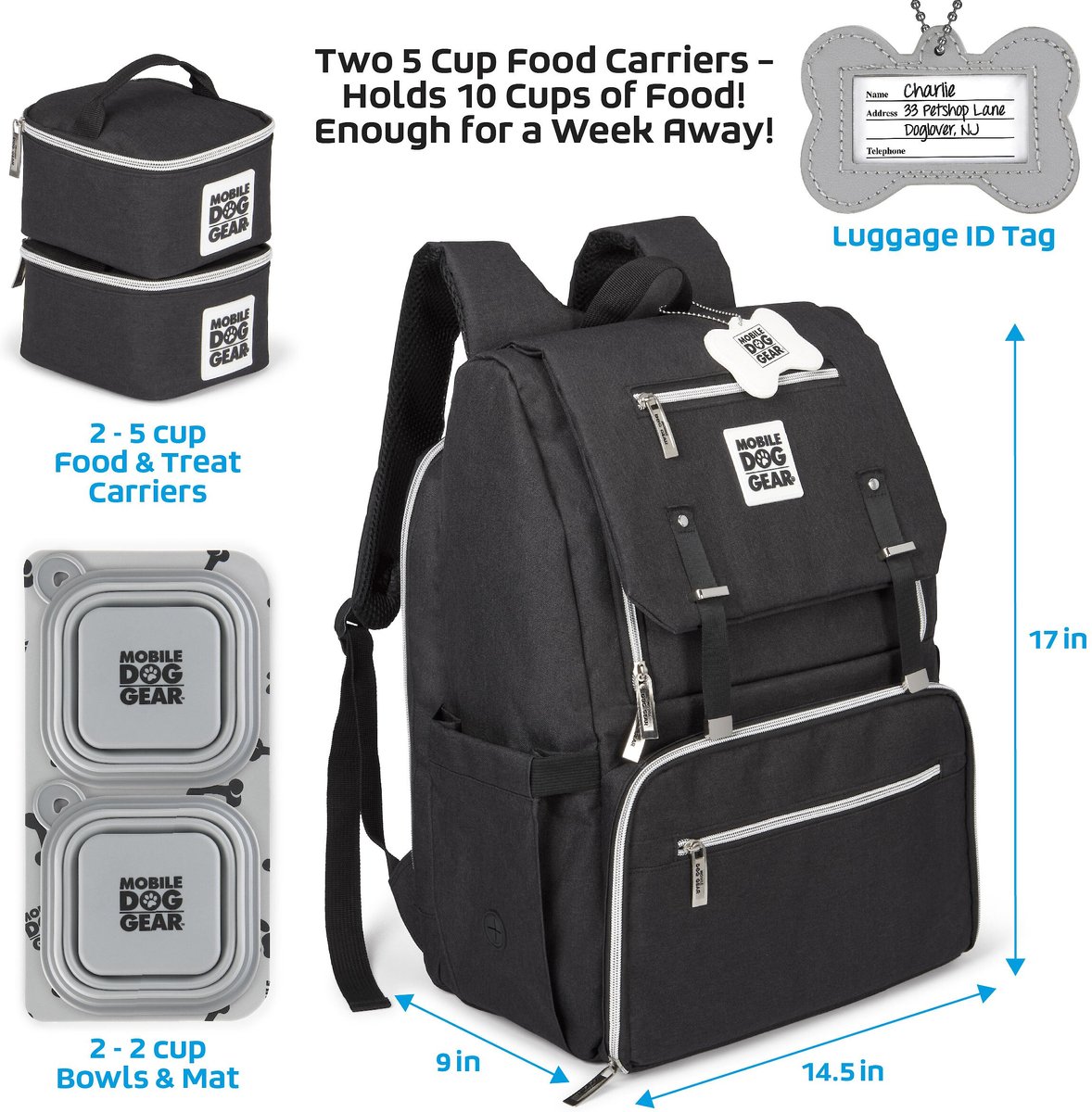 - Includes two 5-cup food carriers, 2 collapsible silicone bowls, a non-stick placemat and a dog bone ID tag.