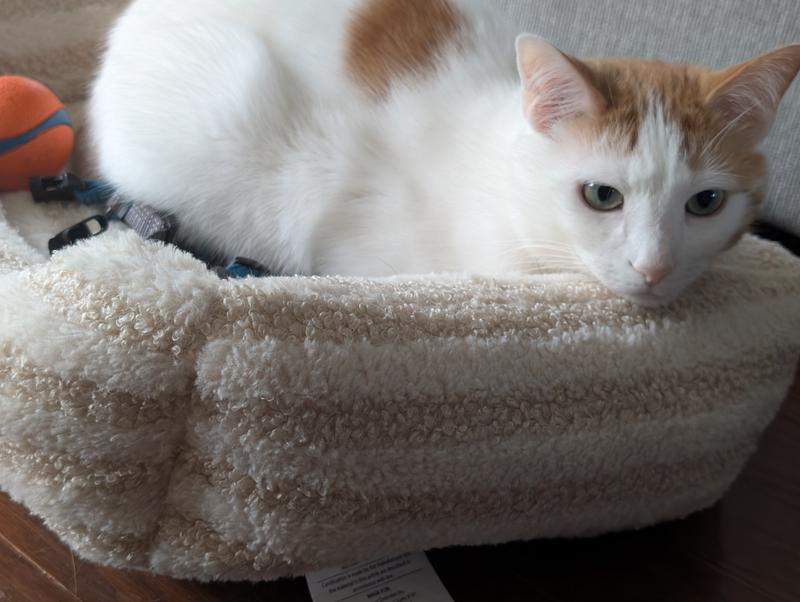 This bed arrived in a very flat box but once opened and massaged per the enclosed instructions, expanded fully into a plush and comfy bed. The size is suitable for a small dog or large cat. It looks very nice and, once cat nipped, attracted all my cats. The winner is my only male, my three-legged Maine Coon, Taco. He has adopted it for his own and looks marvelous lounging in it.
