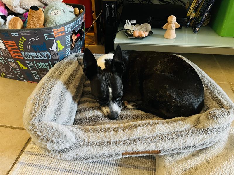 This bed is so cozy and perfect for my 14 lb Boston terrier mix. The gray striped pattern is really cute. My dog loves to lounge in the bed at home but we also took it on a trip recently. We love that it is lightweight and easy to transport. I packed it in a to-go bag along with some other doggy supplies. We used the bed at a cabin on our trip and found that this cozy bed is perfect for travel! It is also machine washable. We love it.