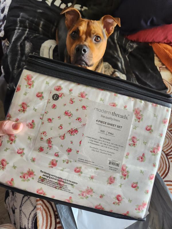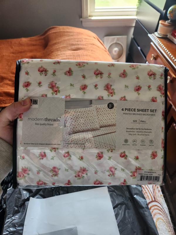 MODERN THREADS Soft Microfiber Solid Bed Sheet Set, Roses on Ivory, fits my bed perfectly. My three Chihuahuas adore these sheets, as they have constructed numerous dens thus far. The sheets exhibit exceptional softness, remain cool, and resist heat retention. The color and pattern are aesthetically pleasing, and the softness persists even after machine washing. I highly recommend this product.