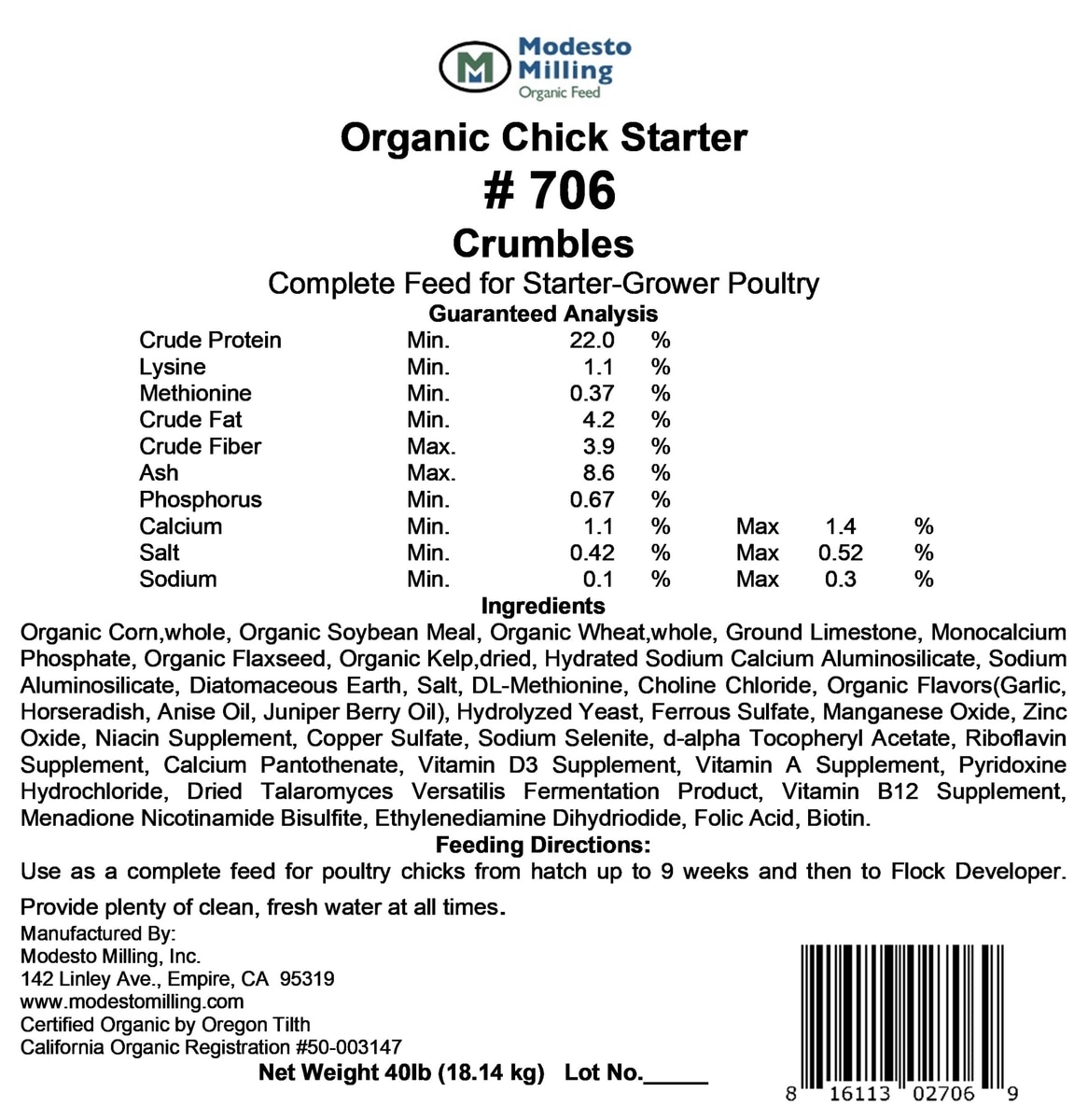 This is starter grower feed for broiler chicks. It has high protein that is needed for broiler chicks to gain weight quickly. Layer chicks do better on starter grower specifically for layer chicks. Chewy offers Kalmbach organic starter grower feed for layer chicks. After reading Chewy's online description of Modesto's feed I mistakenly ordered it for my layer chicks, then read the actual label on the bag and it is grower feed for broilers. Also confusing as to how many weeks to use Modesto's feed--6 weeks? 18 weeks? If you have broiler chicks, try to find out just how long to give them this Modesto. If you have layer chicks, don't buy this and get the Kalmbach instead. Modesto feed is probably just fine for broilers; it is crumbles and dust, but the chicks need tiny particles and seem to eat it with relish. However, I can't rate it, and now have 30 pounds of feed that just might show up in a wild bird feeder this winter.