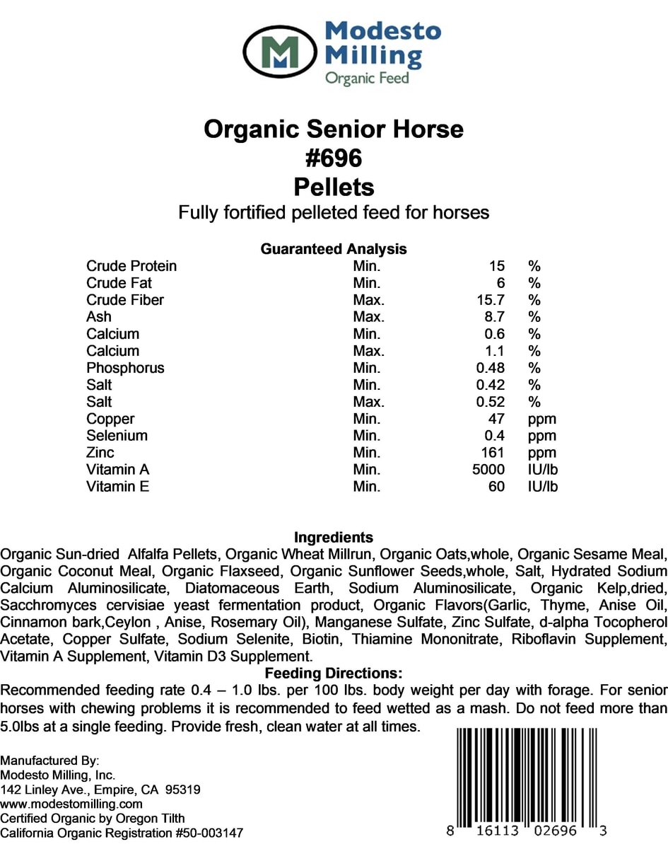 In 1998, Modesto Milling became certified organic through Oregon Tilth to meet USDA organic standards. The Modesto Milling organic feed line makes a great alternative to conventional livestock feeds.