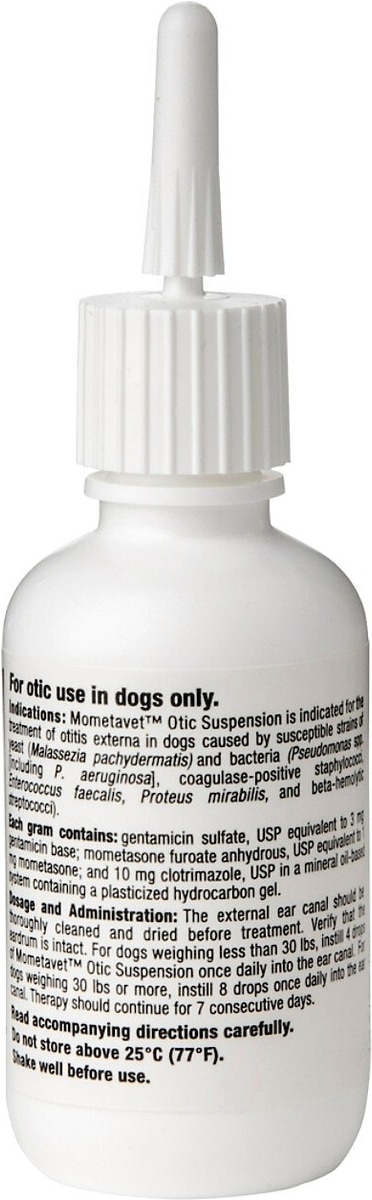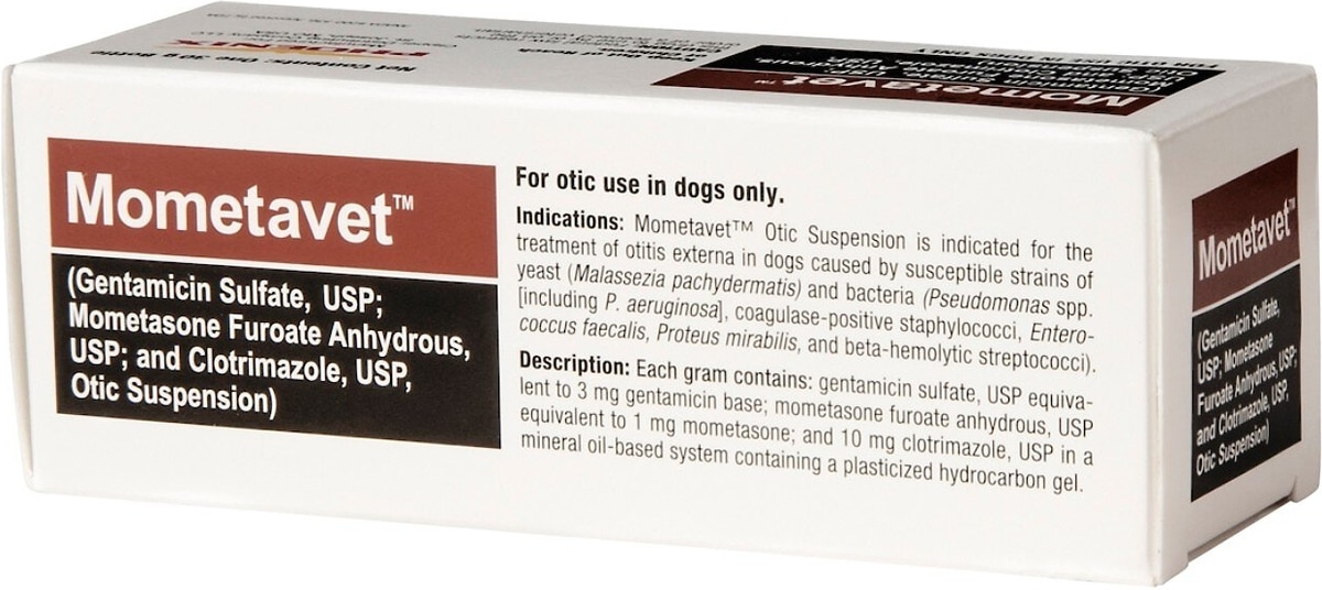 If your dog develops an ear infection, your vet may prescribe Mometavet Otic Suspension for Dogs to help get him feeling better again. This liquid steroid, antibacterial and antifungal medication is designed to treat otitis externa, an infection of your dogs ear canal. This medication works by targeting the strains of yeast and bacteria that cause the infection, helping to relieve the cause of your dogs discomfort.