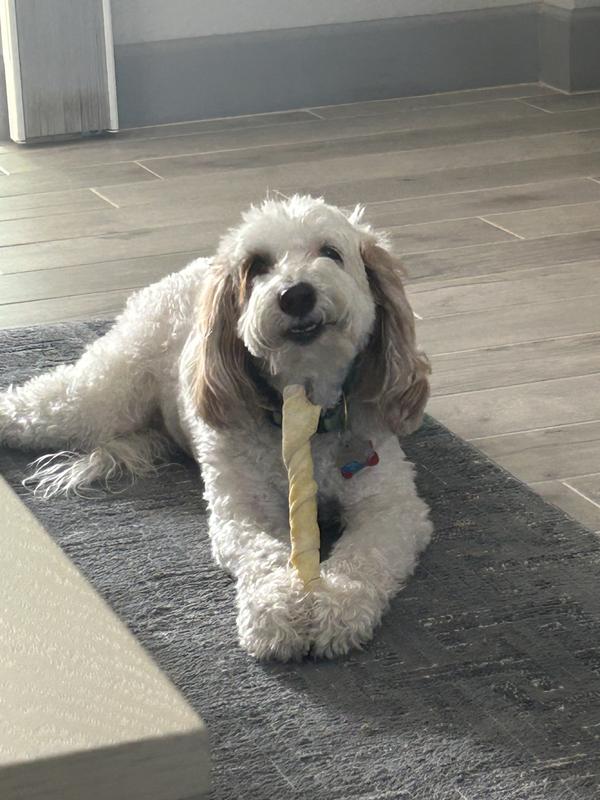 My dog is a big chewer so I’m always looking for new long lasting treats for him. He doesn’t normally like rawhide, but he really likes these. Unfortunately he also