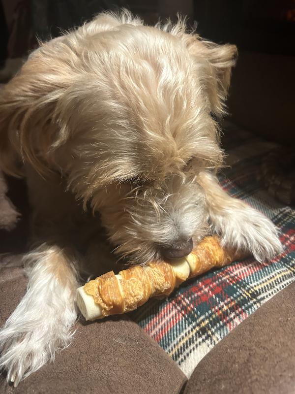 Excellent rawhide! My heavy chewer is now more of a gnawer and this is definitely approved by the old girl! She peeled off the chicken first, paused(pawsed?) to show daddy her wonderful treasure and went right back to work on it. Big positive that they don't smell, break up easier - so much safer - and are still highly palatable and desirable. These are an all around win!