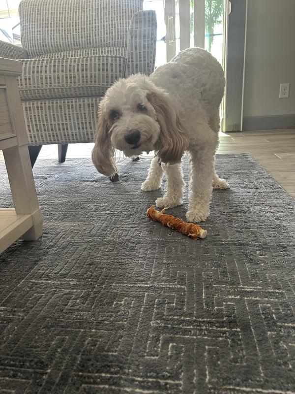 My dog is a big chewer so I’m always looking for new long lasting treats for him. He doesn’t normally like rawhide, but he really likes these. Unfortunately he also gets a bit too into eating them, and will swallow it if I don’t watch him. But he’s fine if I take it away early before it gets to that point. These seemed very fresh, and came in a great bag. They’re also huge! I was surprised at how large they are. Very nice retriever roll. He loved the chicken jerky exterior too. Overall it was a hit, I just have to make sure I watch him (which we should all be doing anyways).