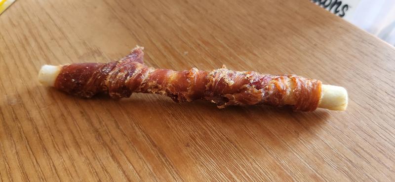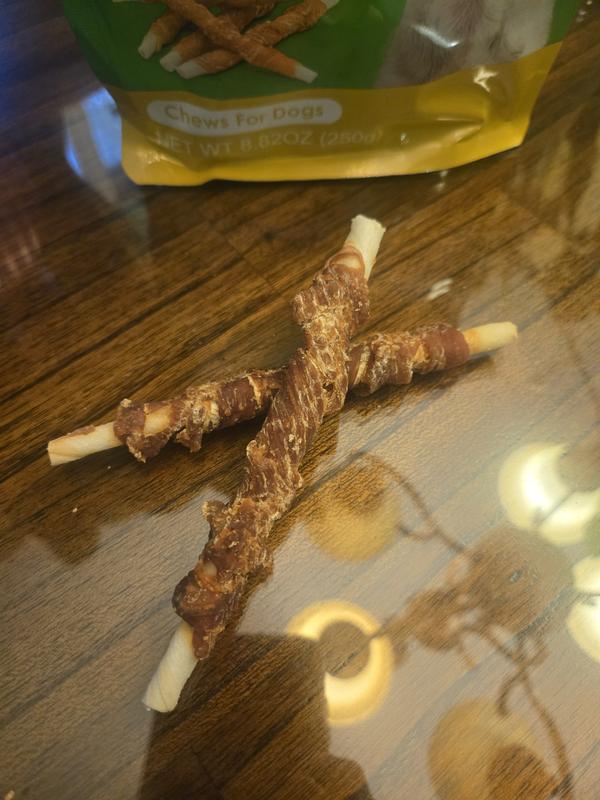 These are exactly what I had been looking for! Small rawhide straws wrapped in chicken give Izzy an immediate treat with the chicken and then keep her occupied for almost 10 minutes while she chews the rawhide. The small size is perfect, as it gives her some chewing time without overdoing it, as she does with bigger rawhide treats. And there's no smell to the treats, which I appreciate.