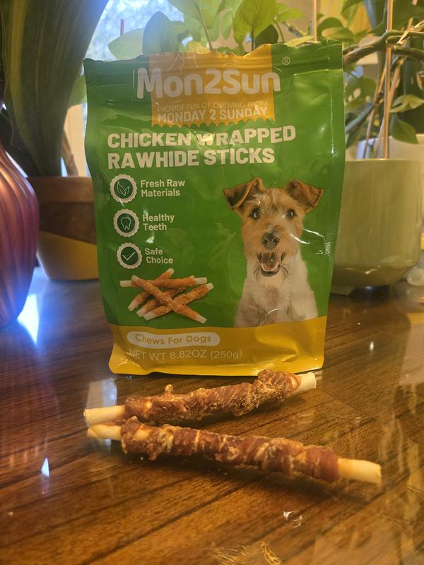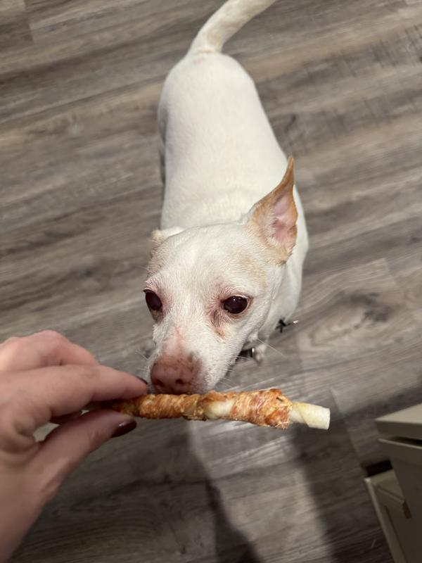 These chicken wrapped rawhides were a big hit with our 9 and 5 lb chihuahuas. They immediately grabbed them when we opened the package and handed them one. As