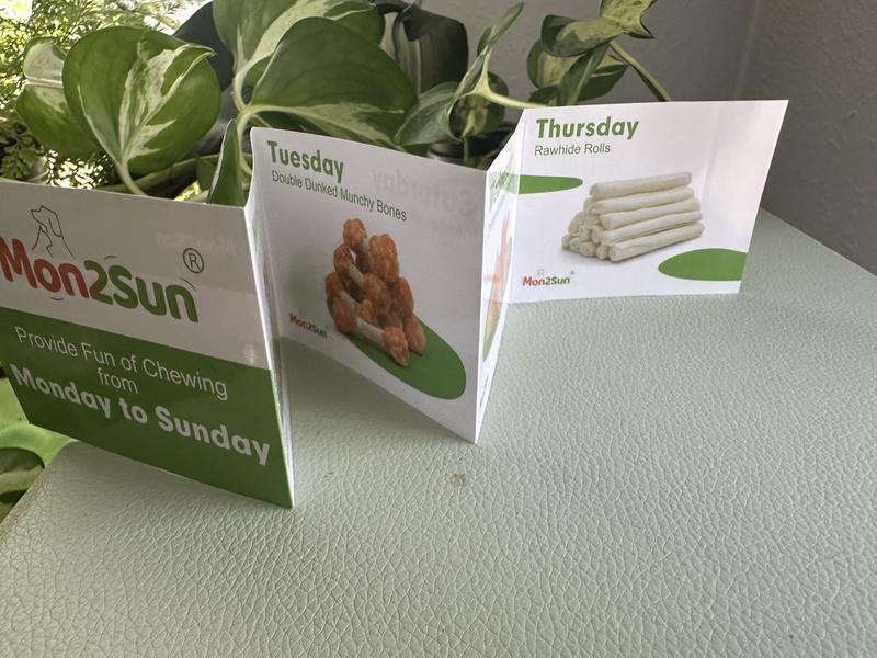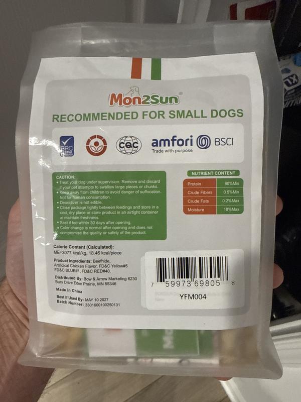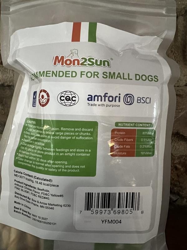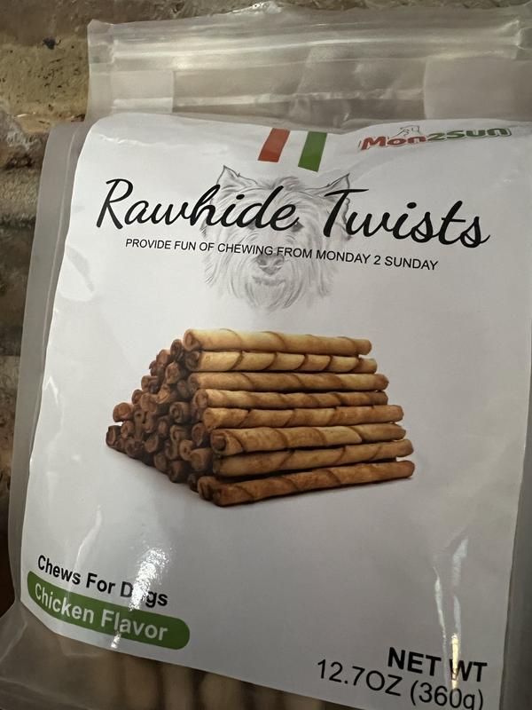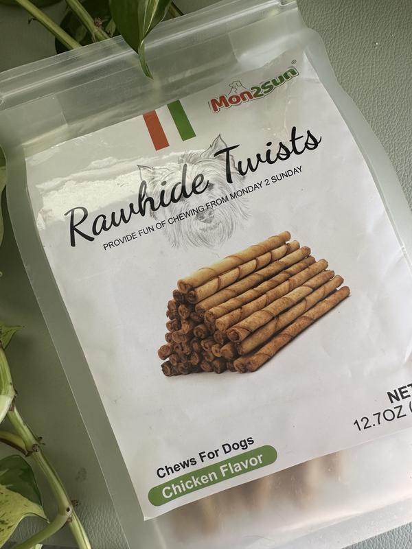 These rawhide twists were a great little distraction for my dog! They have a nice firm texture that kept her busy for a long time, which I really appreciate. I also love that the packaging includes a small guide showing other treats in their lineup, it’s a cute touch and gives me ideas for different chewing options throughout the week. The resealable bag is convenient too and keeps everything fresh. My dog enjoyed the chicken flavor and had a great time working on these. Just make sure to always supervise your pup while they chew!