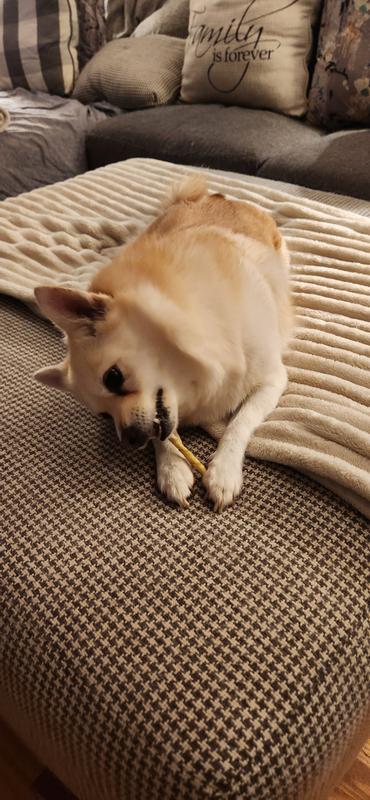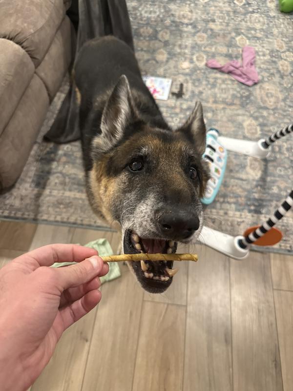 So, everyone knows that German shepherds are notorious for having stomach issues and digestive issues, especially as they get older. When I selected these, I was excited to get them because I’m relatively limited on actual “treats” that I can give him outside of his regular food that won’t upset his stomach. The first thing I noticed was that the ingredient label was very “clean”. I love that they’re made in America and not overseas. Even though he’s a larger shepherd, I typically give him two or three of these at a time and it still takes him about 10 or 15 minutes to finish them. I have no complaints about these whatsoever, he actually gets excited whenever I go to his “treat drawer” and he sees me bring out the bag. These are very well constructed, if you have a smaller dog, I don’t see any reason whatsoever why they wouldn’t get about 45 minutes of chew time out of these. These are a great price as well, if you’re looking for a clean dog treat that doesn’t have a bunch of unnecessary chemicals and additives in it, I highly recommend these.
