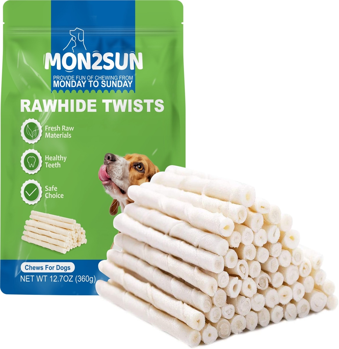 This is a great value pack of 5", very thin 100% beef "raw" hide chews intended for dogs. When the box arrived, all 4 of my animals [2 dogs and 2 cats] smelled them and wanted to help me open the box. These are all natural with nothing added so are palatable and digestable. The pack is a good value. I didn't count how many chews are in the bag but there are tons of them. There is an insert included that has suggestions on variations of what to add to each chew to feed one per day. "Mon2Sun" means "Monday to Sunday" treats!!! I really appreciate that these are natural and digestable, however, for my dogs, they are much too small, especially for my Petite Hound [PBGV] that has a HUGE mouth and jaw, even though he's only 35#. What I found surprising is that both of my kitties each took off with a chewy. I've been trying cat chewing products with no success until these!!! I recommend these for very small dogs that will actually chew them rather than try to swallow them whole..
