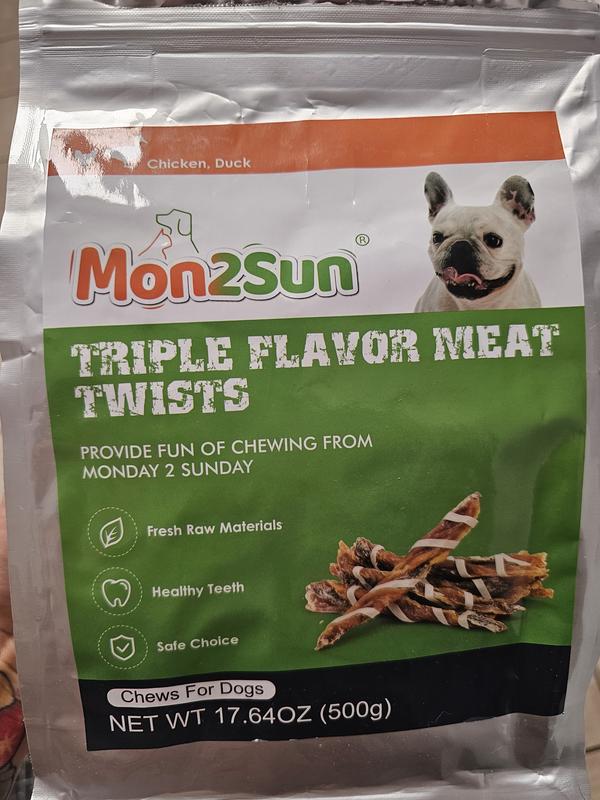 The Mon2sunTriple Flavor Jerky Twist Sticks are appealing, smell good and my dog loved them. That said the reason for a 4 is the packaging said don't swallow big