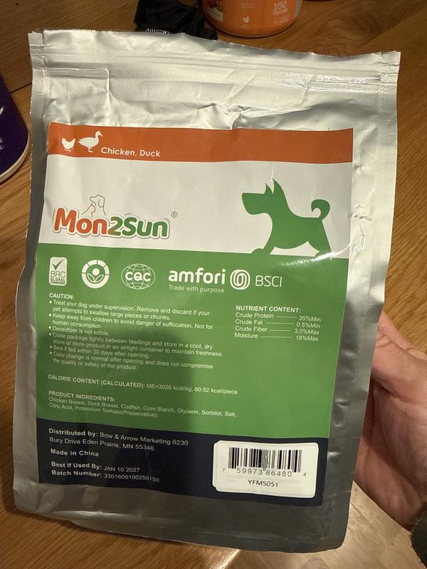 • Made with real chicken breast, duck breast, and codfish for a high-protein, low-fat snack.