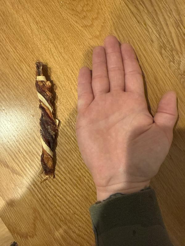 These are a great snack for meduim to extra large dogs. My big guy loves these chewie treats! They are a good size for his mid-day snack. He eats it up within a minute or two, so they are not too hard.