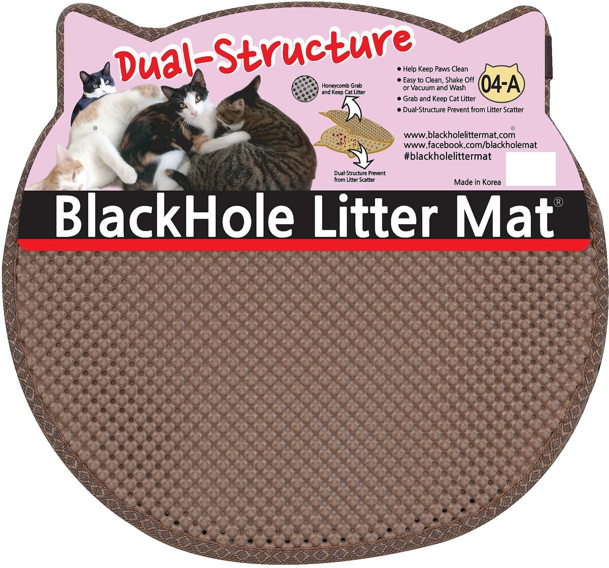 BlackHole Litter Mat is cat litter mat you can place near your cat's litter box that can prevent cat litter scattering by trapping litter. The litter falls down in to the holes and is caught by the bottom layer. That way it doesn't get scattered all over.
