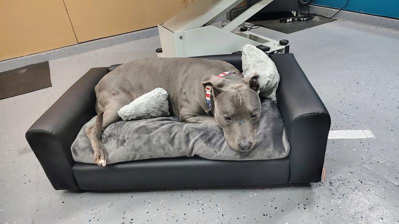 Milo's favorite spot in the world used to be on a nasty old 70s couch that was in a car shop. It was easily his favorite place on the planet, so it broke my heart that I couldn't explain to him that sometimes people change, and that he couldn't lay on his couch anymore since we weren't going back. So I went looking for a couch he could have at my grooming shop, one that would be all his forever. This couch is perfect for the wet and pretty much gross atmosphere that is a dog grooming salon. I can easily wipe the 'leather' to keep it clean, the cushion has waterproof lining, and the feet keep him out of the water on the floor. I looked at several dozen couches and I'm so glad I found this one! Milo is probably about 70lbs now (he is afraid of the scale at the vet so they don't weigh him lol). He fits great and is so excited to run to his couch when we get to work now! I will mention that he is a small sleeper though, he prefers to be in a ball rather than sprawled out. He might look a little smoosher in the pics, but he would lay the same way of it were twice the size haha he uses the little throw pillows as chin cushions, it's adorable. Great purchase!