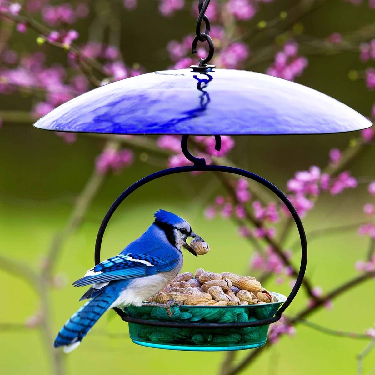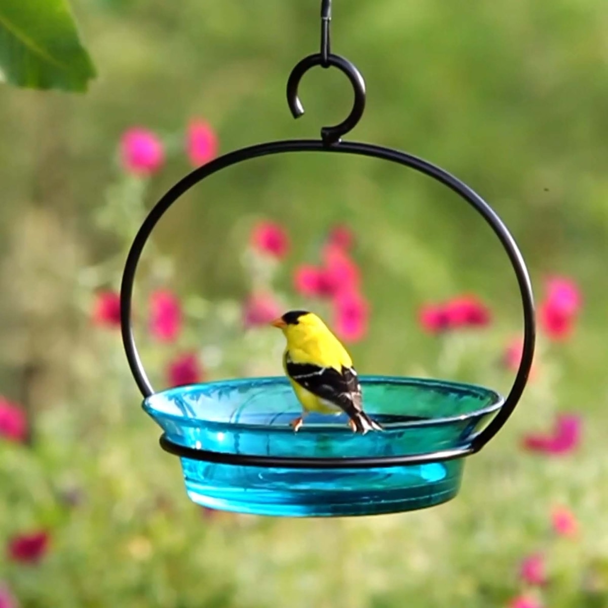 This bird bath/feeder includes a glass bowl and a powder-coated metal hanger.