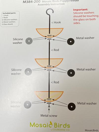 I paired the blue glass Poppy triple feeder by Mosaic with their blue glass dome baffle. It looks wonderful on a shepherd hook in the back yard. Birds love the layers of sunflower, safflower and mealworms. I love the look of the feeder. All parts were included as well as options of 2 different washers: solid rubber washer or nylon washer which allows water to drain thru the glass bowls. I opted for the nylon washer but the baffle has kept rain water out of the seed bowls.