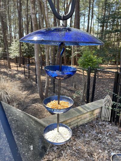 I paired the blue glass Poppy triple feeder by Mosaic with their blue glass dome baffle. It looks wonderful on a shepherd hook in the back yard. Birds love the