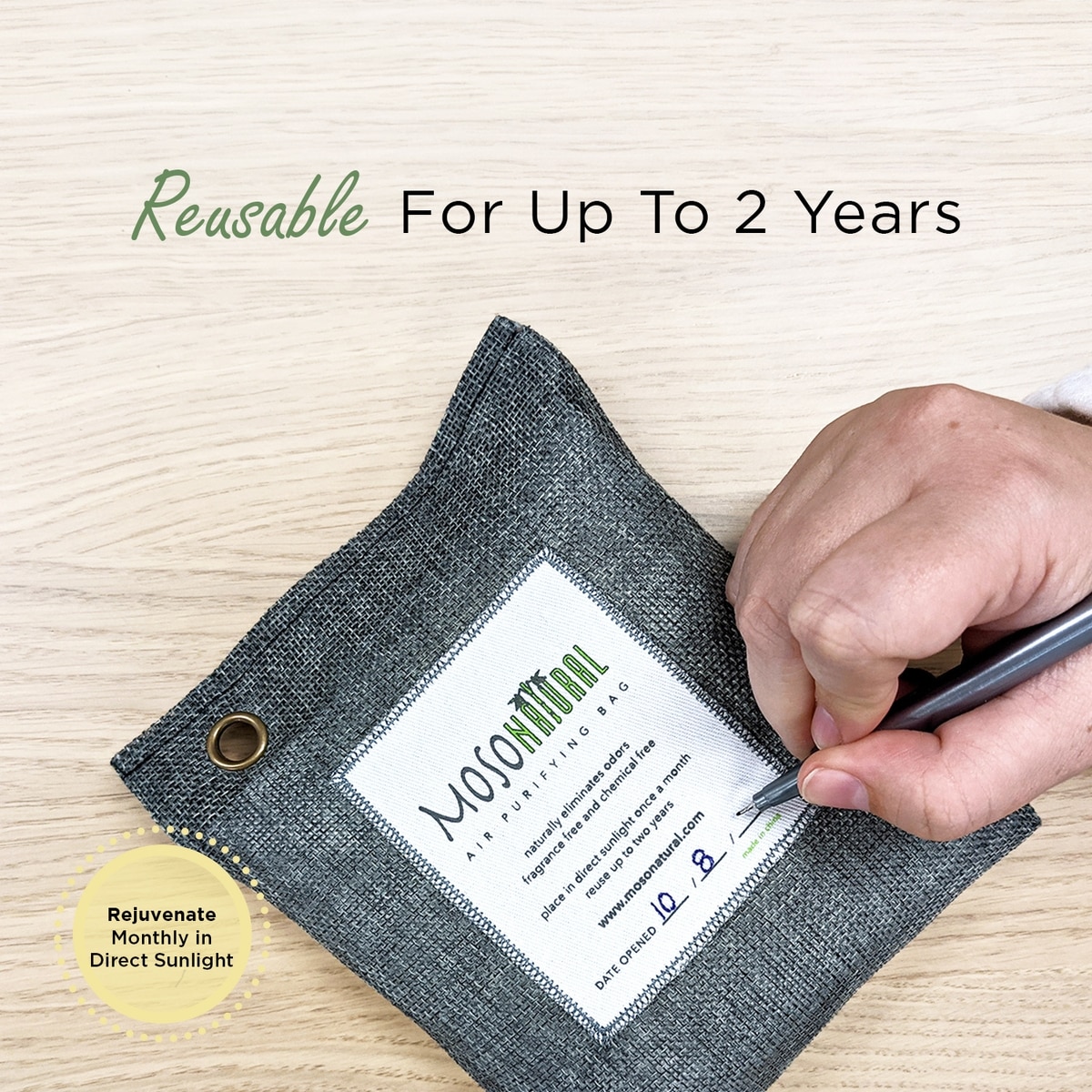 The bag can be refreshed monthly for up to 2 years of continuous use by simply placing bag in the sun to rejuvenate charcoal.