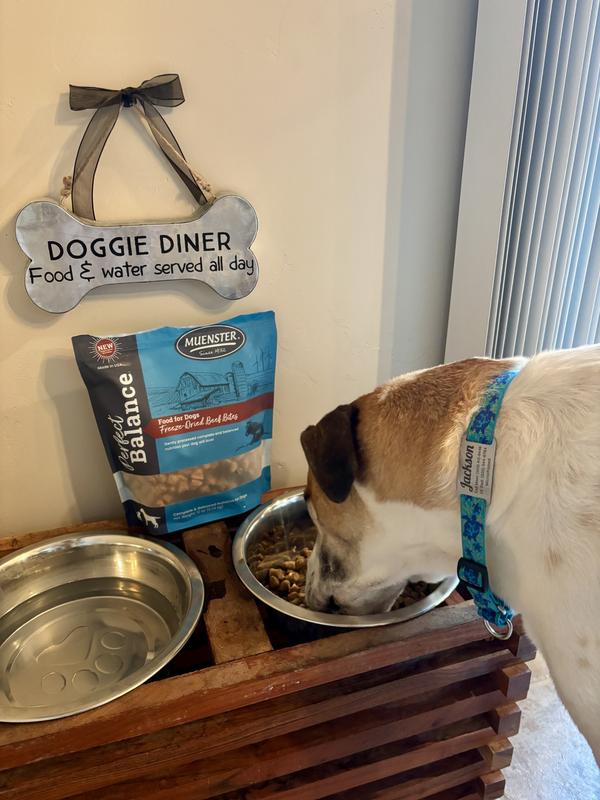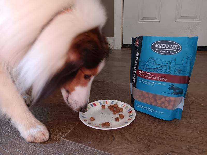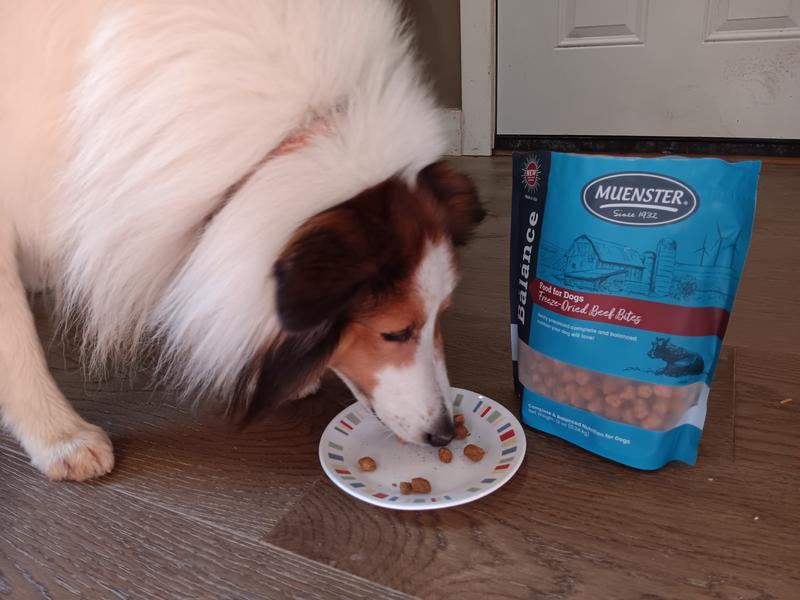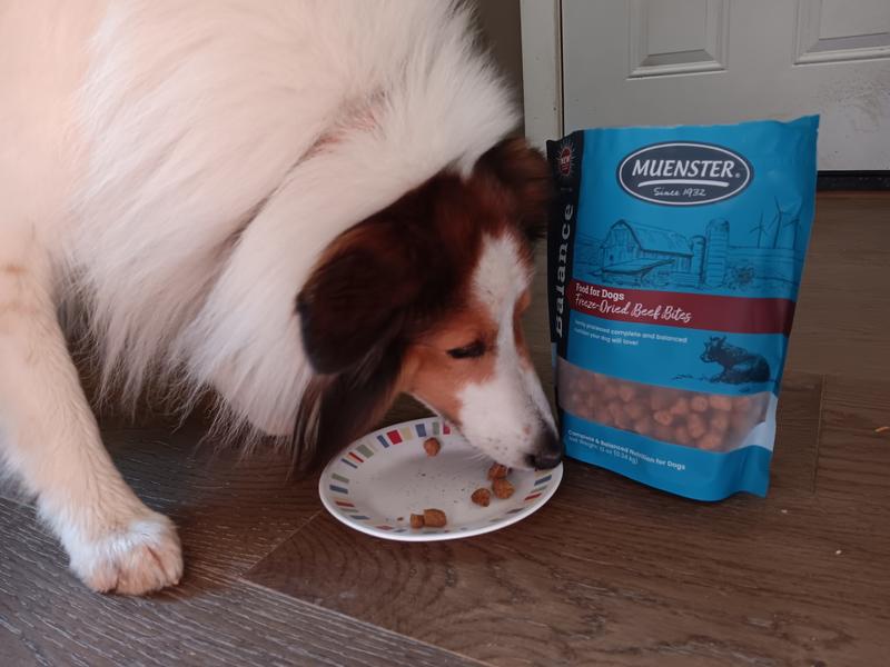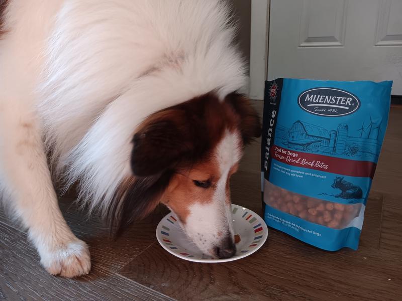 We recently tried Muenster freeze dried beef bites food for dogs. We had requested chicken but were shipped the beef in error. Luckily the dogs didn’t care. They