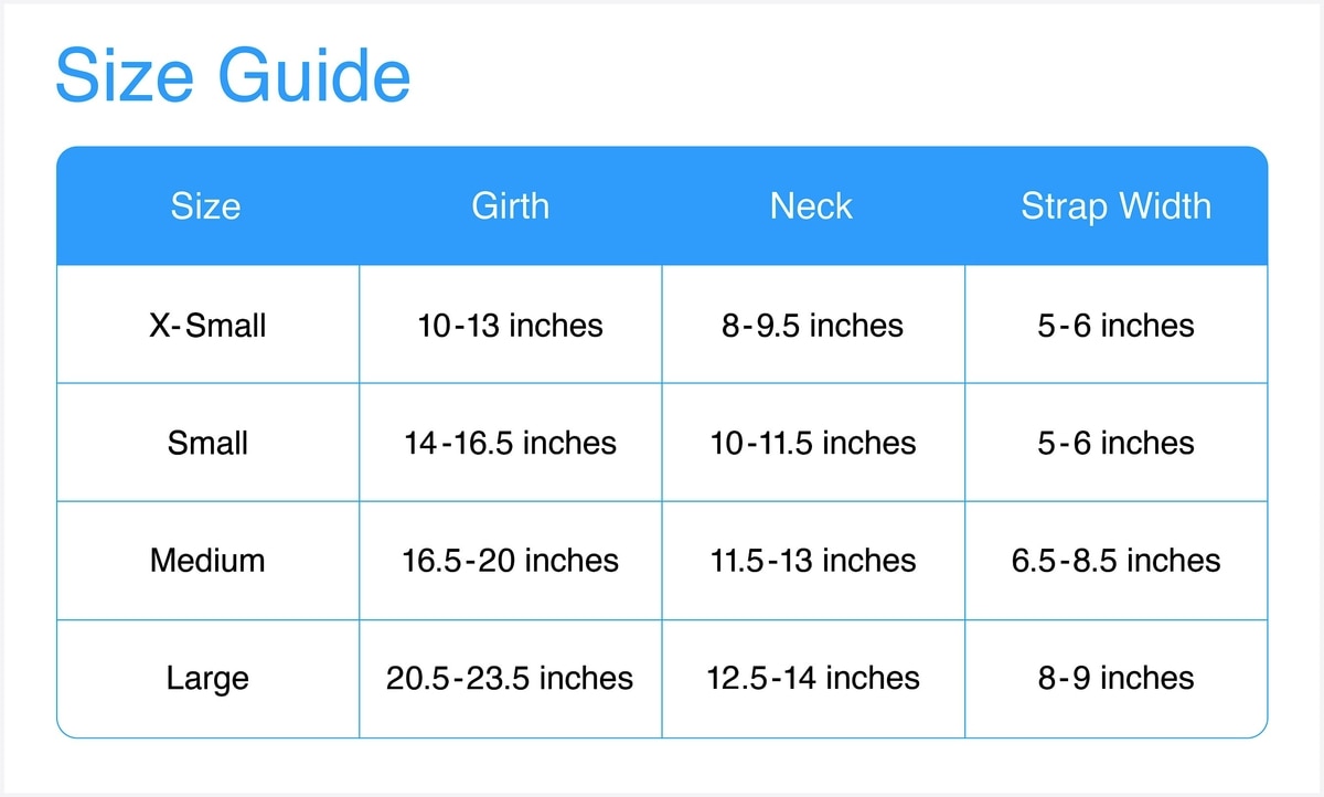 The sizing chart may be located by clicking the “Size” tab, next to the “Description” and “Instructions” tabs, just under the product photos. To determine the best size we recommend that you measure your dog's chest girth (circumference), neck girth (circumference) and profile. To measure the chest girth you'll measure around the broadest part of the rib-cage behind the front legs and to measure for the neck girth you'll measure at the broadest part of the neck. To measure the profile you'll measure starting at the tip of the nose and end at the back of their head, just behind their ears. If the dog happens to be in between sizes it's then recommended to select the bigger size.