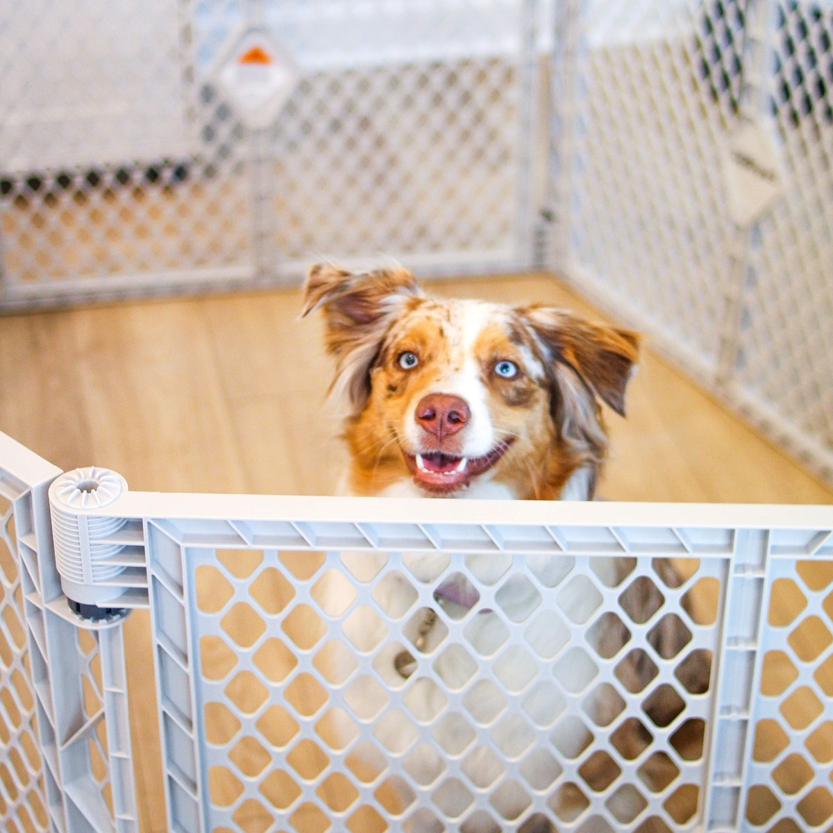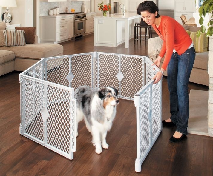 I gave 4 stars because it was difficult for me to put together. I am 67 so could be why. I got it so my 4 month old Yorkie wouldn't be in her crate if I was gone a few hours and would be safe. It works well and I don't have to worry if I have to leave her home. I keep it in a part of my kitchen which is small but it is just me and my puppy so it works for us.