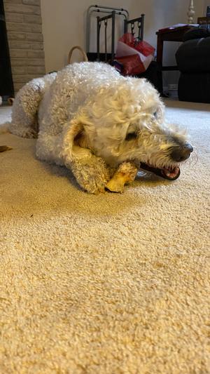 My 6 month old pup loves any kind of dried meat chew but she would work through a bulky stick within an hour and then I’d have a choking hazard on my hand in the blink of an eye. These ostrich foot chews keep her attention better than any bully and lasts for days! Will be keeping these in stock at all times.
