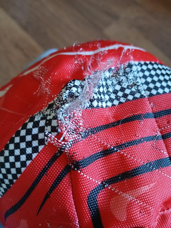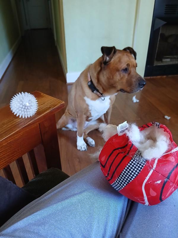 Ripped the very first time that the dog retrieved it. The dog's teeth went trough the outer fabric which then ran similar to a snag in nylons. She quickly removed the flimsy outermost fabric to access the small squeaker ball within. Squeaky ball is ridiculously small compared to the mostly batting filled plush helmet