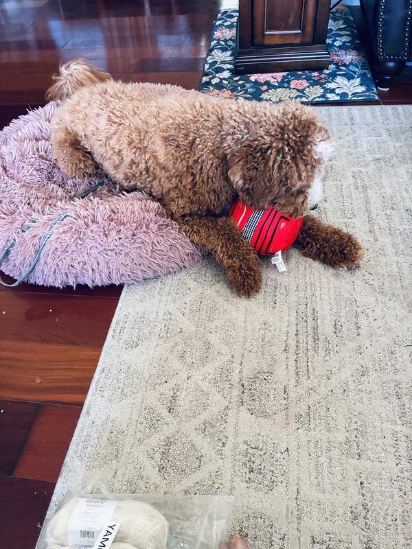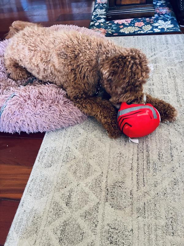 When this toy arrived, I thought it would be way too big for my little dogs, but they had no trouble grasping and playing with it and it’s still in one piece. They’re small, but they’ve got mighty jaws.