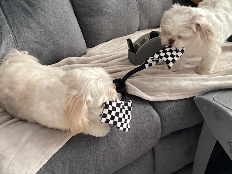 • This official NASCAR rope tug toy features a crinkle checkered flag design for winning pups.