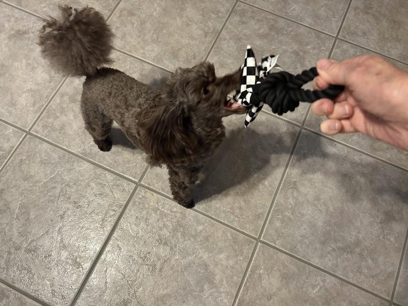 My mini poodle, Snap, loves this toy. She is a high powered tugger and it has held up with her play.She also loves the crinkle noise! The rope is hardy enough for